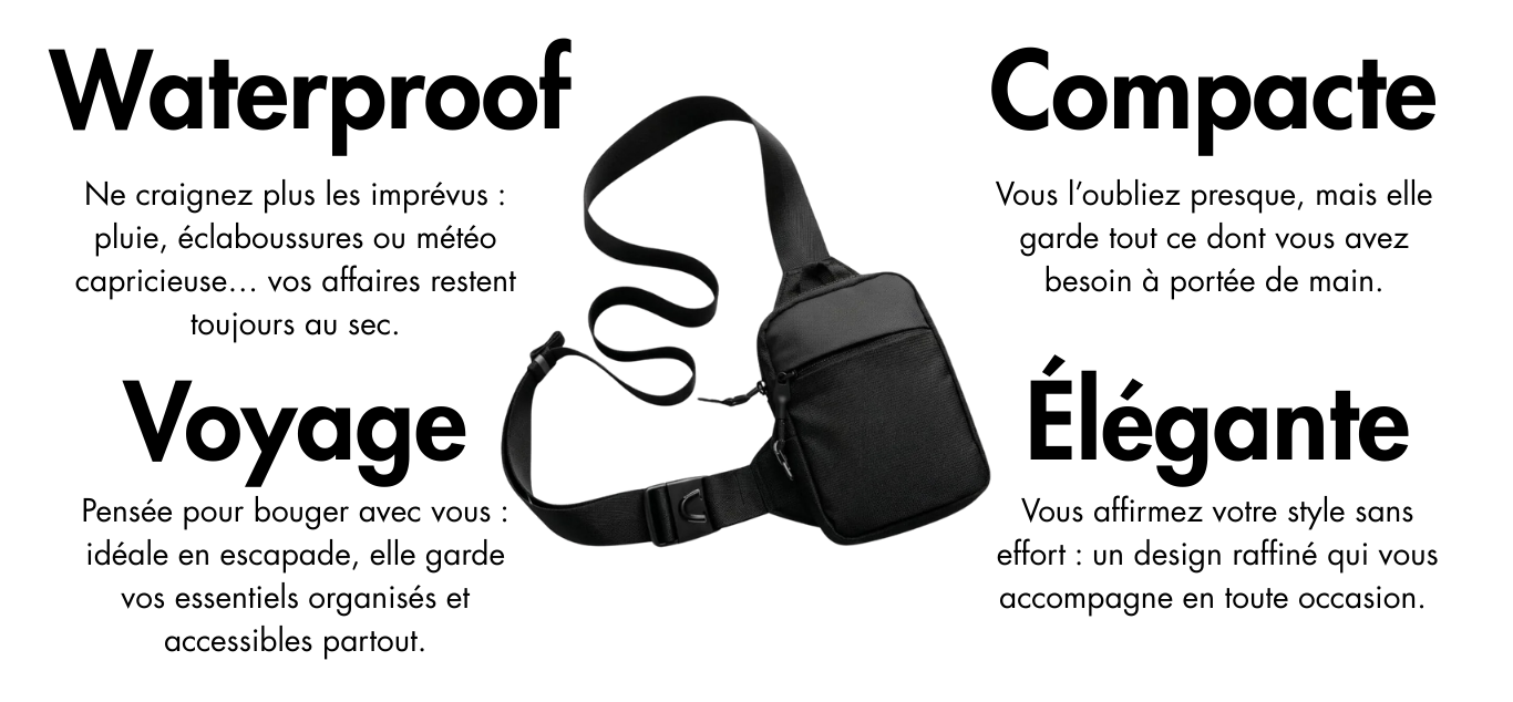 - Volume : 1,6 L — idéal pour smartphone, portefeuille, clés, lunettes, powerbank, passeport